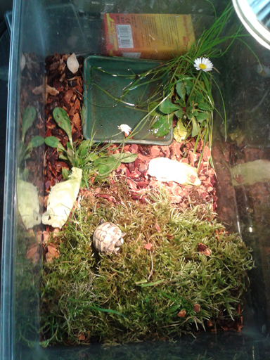 ![]() Ein kleines Terrarium mit Eintreu, kl. Wasserschale, Sepiastein, etwas Grün, leichtes Moos zum Verkriechen, Salatblatt |