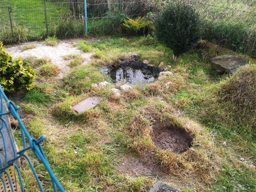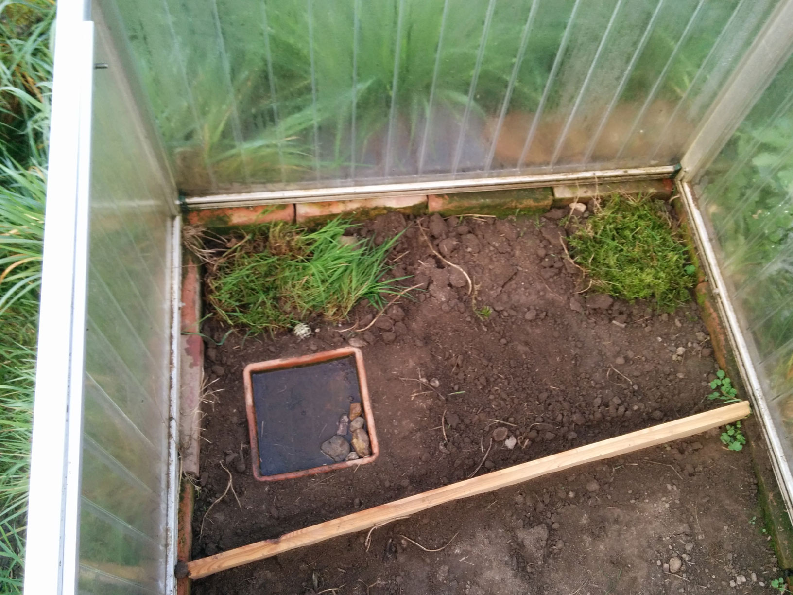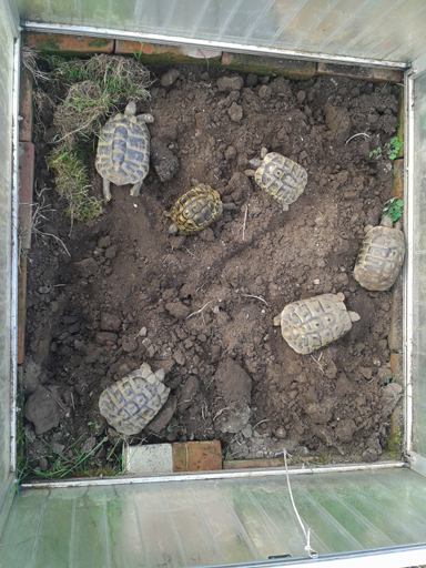 | Das Erdreich im Schildyhaus (Winterquartier) wurde von mir gelockert, die Schildys nach dem Wiegen eingesetzt und der Eingang mit Backsteinen verschlossen. Hier kommt später noch etwas Heu hinein. Wichtig, so lang kein Frost ist, das Erdreich schön feucht halten. Auch mache ich im Winter wenn Die Schildys sich vergraben haben, das Dach auf und lasse Regen und Schnee rein. Dies hilft, alles schön feucht zu halten. |